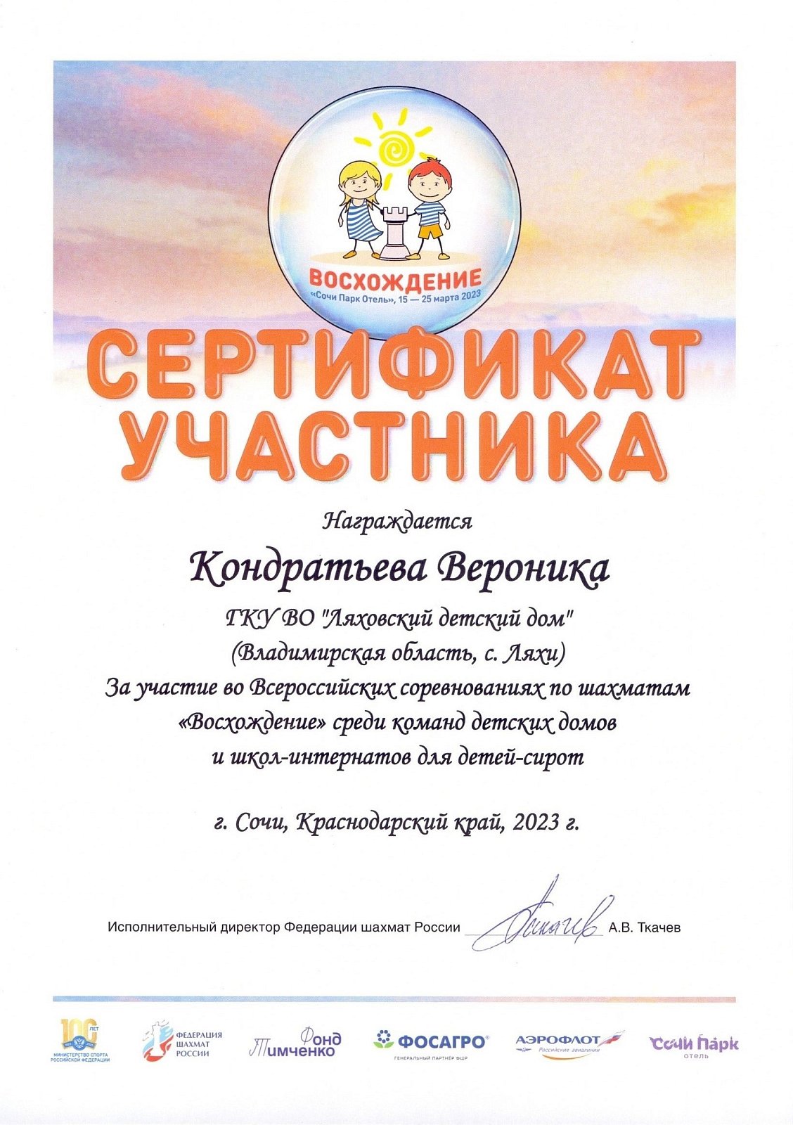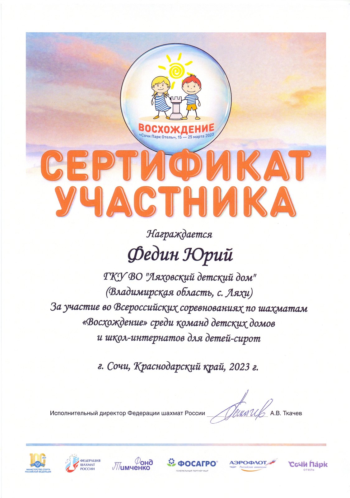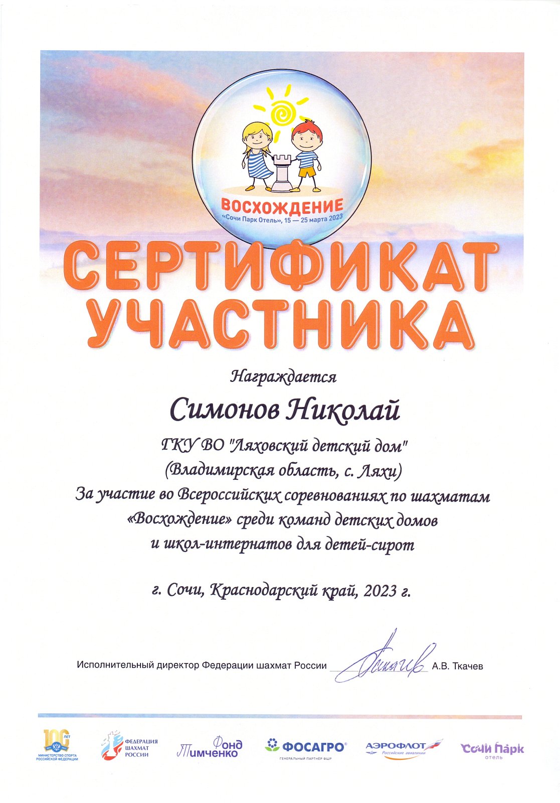 Завершились седьмые Всероссийские соревнования по шахматам среди команд детских домов и школ-интернатов для детей-сирот «Восхождение», которые проходили с 15 по 25 марта 2023 года в оздоровительном комплексе «Сочи Парк Отель» (Краснодарский край, Адлерский район, п.г.т. Сириус). В соревновании приняли участие 47 команд из 32 регионов России.